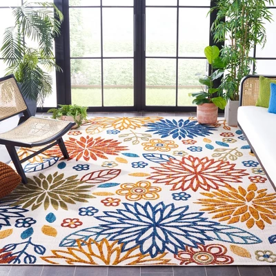 Cabana Indoor/Outdoor Rugs offer a selection of elaborate floor coverings for any busy area of the home, inside or out. Playful florals, lush vines, and fanciful geometric motifs brim with “staycation” vibes on any deck, porch, or patio. Cabana patio rugs are made using durable synthetic yarns for resistance to weather, wear, mold, mildew, and fading from the sun. Care Instructions: Vacuum Without Beater Bar